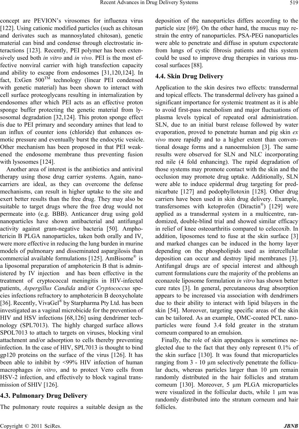Recent Advances in Drug Delivery Systems519 concept are PEVION’s virosomes for influenza virus [122]. Using cationic modified particles (such as chitosan and derivates such as mannosylated chitosan), genetic material can bind and condense through electrostatic in- teractions [123]. Recently, PEI polymer has been exten- sively used both in vitro and in vivo. PEI is the most ef- fective nonviral carrier with high transfection capacity and ability to escape from endosomes [31,120,124]. In fact, ExGen 500TM technology (linear PEI condensed with genetic material) has been shown to interact with cell surface proteoglycans resulting in internalization by endosomes after which PEI acts as an effective proton sponge buffer protecting the genetic material from ly- sosomal degradation [32,124]. This proton sponge effect is due to PEI primary and secondary amines that lead to an influx of counter ions (chloride) that enhances os- motic pressure and eventually burst the endocytic vesicle. Other mechanism has been proposed in that PEI weak- ened the endosome membrane thus preventing fusion with lysosomes [124]. Another area of interest is the antibiotics and antiviral therapy using those drug carrier systems. Again, nano- carriers are ideal, as they can overcome the defense mechanisms, can result in higher uptake to the site and exert better results than the free drug. They may also be suitable to target drugs where the free drug would not permeate into (e.g. BBB). Anticancer drug using gold nanoparticles have shown antibacterial and antifungal activity against gram-negative bacteria [50]. Ampho- tericin B PLGA nanoparticles, taken both orally and IV, were more e ffective in re ducing the lun g burden i n murine models of pulmonary and disseminated aspargilosis than commercial available formulations [125]. AmBiso me® is a liposomal preparation of amphotericin B that is admin- istered by IV injection and has been effective in the treatment of cryptococcal meningitis in HIV-infected patients, Aspergillus Candida and/or Cryptococcus spe- cies infections refractory to amphotericin B deoxycholate [36]. Rece ntly, VivaGel ® by Starp harma Pty Ltd. has bee n investigated as a vaginal m icrobicide for the prevention of HIV and HSV infections [68,126] using dendrimer tech- nology (SPL7013). The highly charged surface allows SPOL7013 to attach to targets on viruses, blocking viral attachment and/or adsorption to cells thereby preventing infection. In the case of HIV, SPL7013 is though t to bind gp120 proteins on the surface of the virus [126]. It has been able to inhibit by <99% HIV infection of human macrophages in vitro, and to protect Vero cells from HSV-2 infection, and effectively to block vaginal trans- mission of SHIV [126]. 4.3. Pulmonary Drug Delivery The pulmonary route requires a suitable design as the deposition of the nanoparticles differs according to the particle size [69]. On the other hand, the mucus may re- strain the entry of nanoparticles. PSA-PEG nanoparticles were able to penetrate and diffuse in sputum expectorate from lungs of cystic fibrosis patients and this system could be used to improve drug therapies in various mu- cosal surfaces [88]. 4.4. Skin Drug Delivery Application to the skin desires two effects: transdermal and topical effects. The transdermal delivery has gained a significant importance fo r systemic treatment as it is able to avoid first-pass metabolism and major fluctuations of plasma levels typical of repeated oral administration. SLN, due to an initial burst release followed by water evaporation, proved to penetrate human and pig skin ex vivo more rapidly and to a higher extent than conven- tional dosage forms and a nanoemulsion [3]. The same results were observed for SLN and NLC incorporating red nile (4 fold enhancing). The rapid degradation of those systems may promote contact with the skin and the occlusion may promote drug uptake. Additionally, SLN were able to induce epidermal drug targeting for pred- nicarbate [127] and podophyllotoxin [128]. Other drug carriers have been used in skin drug delivery. Example, transfersomes with ketoprofen (Diractin®) [129] were applied as a transdermal system in a multicentre, ran- domized, double-blind trial and showed similar efficacy in relief of knee osteoarthritis compared to celecoxib. In addition, liposomes tend to fuse at the skin surface [3] and marked changes can be induced in the horny layer depending on the phospholipids used as intercellular deposition can occur and destroy lipid membranes [3]. Antifungal drugs are of special interest and although current formulations cure the majority of th e problems an econazole liposome formulation in vitro has shown better cure rates [3]. In general, percutaneous drug absorption appears to be increased via association with dendrimers due to their ability to interact with lipid bilayers in the skin [54]. Moreover, targeting specific areas of the skin can be tailored. As an example, OMC-coated PCL nano- particles were found 3.4 fold greater in the stratum corneum compared to an emulsion. Finally, the role of skin appendages is sometimes ne- glected due to the fact that they only represent 0.1% of the skin surface [130]. It was found that microparticles ranging from 3 - 10 µm selectively penetrate the follicu- lar ducts, whereas particles larger than 10 µm remain randomly distributed in the hair follicles and stratum corneum [130]. Moreover, 5 µm PLGA microparticles were visualized in the follicular ducts, while 1 µm was randomly distributed into the stratum corneum and hair follicles. Copyright © 2011 SciRes. JBNB