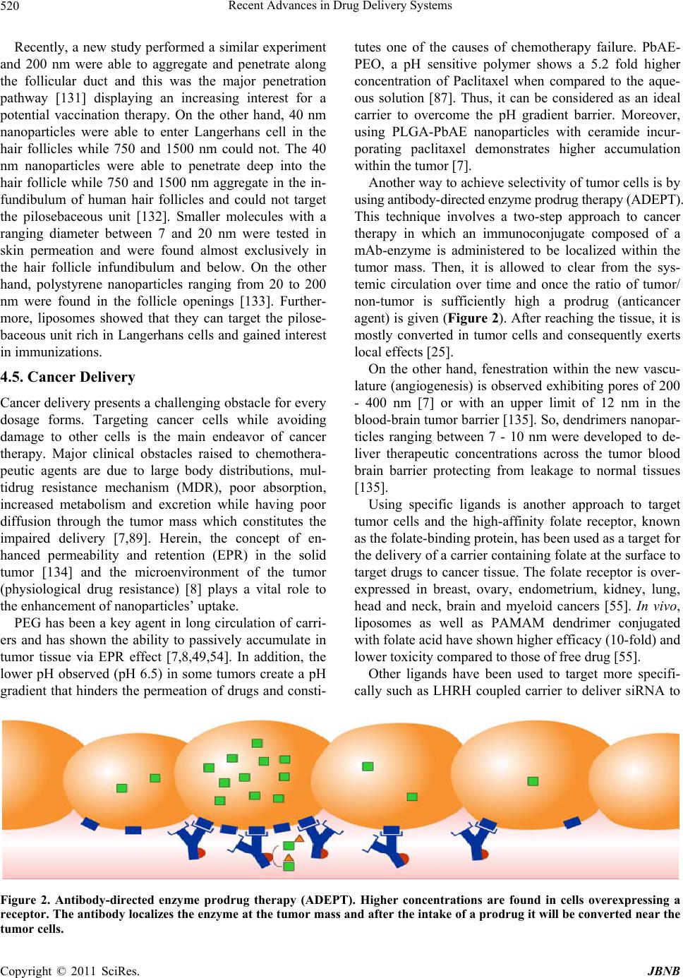 Recent Advances in Drug Delivery Systems Copyright © 2011 SciRes. JBNB 520 Recently, a new study performed a similar experiment and 200 nm were able to aggregate and penetrate along the follicular duct and this was the major penetration pathway [131] displaying an increasing interest for a potential vaccination therapy. On the other hand, 40 nm nanoparticles were able to enter Langerhans cell in the hair follicles while 750 and 1500 nm could not. The 40 nm nanoparticles were able to penetrate deep into the hair follicle while 750 and 1500 nm aggregate in the in- fundibulum of human hair follicles and could not target the pilosebaceous unit [132]. Smaller molecules with a ranging diameter between 7 and 20 nm were tested in skin permeation and were found almost exclusively in the hair follicle infundibulum and below. On the other hand, polystyrene nanoparticles ranging from 20 to 200 nm were found in the follicle openings [133]. Further- more, liposomes showed that they can target the pilose- baceous unit rich in Langerhans cells and gained interest in immunizations. 4.5. Cancer Delivery Cancer delivery presents a challenging obstacle for every dosage forms. Targeting cancer cells while avoiding damage to other cells is the main endeavor of cancer therapy. Major clinical obstacles raised to chemothera- peutic agents are due to large body distributions, mul- tidrug resistance mechanism (MDR), poor absorption, increased metabolism and excretion while having poor diffusion through the tumor mass which constitutes the impaired delivery [7,89]. Herein, the concept of en- hanced permeability and retention (EPR) in the solid tumor [134] and the microenvironment of the tumor (physiological drug resistance) [8] plays a vital role to the enhancement of nanoparticles’ uptake. PEG has been a key agent in long circulation of carri- ers and has shown the ability to passively accumulate in tumor tissue via EPR effect [7,8,49,54]. In addition, the lower pH observed (pH 6.5) in some tumors create a pH gradient that hinders the permeation of drugs and consti- tutes one of the causes of chemotherapy failure. PbAE- PEO, a pH sensitive polymer shows a 5.2 fold higher concentration of Paclitaxel when compared to the aque- ous solution [87]. Thus, it can be considered as an ideal carrier to overcome the pH gradient barrier. Moreover, using PLGA-PbAE nanoparticles with ceramide incur- porating paclitaxel demonstrates higher accumulation within the tumor [7]. Another way to achieve selectivity of tumor cells is by using antibody-directed enzyme prodrug therapy (ADEPT). This technique involves a two-step approach to cancer therapy in which an immunoconjugate composed of a mAb-enzyme is administered to be localized within the tumor mass. Then, it is allowed to clear from the sys- temic circulation over time and once the ratio of tumor/ non-tumor is sufficiently high a prodrug (anticancer agent) is given (Figure 2). After reaching the tissue, it is mostly converted in tumor cells and consequently exerts local effects [25]. On the other hand, fenestration within the new vascu- lature (angiogenesis) is observed exhibiting pores of 200 - 400 nm [7] or with an upper limit of 12 nm in the blood-brain tumor barrier [135]. So, dendrimers nanopar- ticles ranging between 7 - 10 nm were developed to de- liver therapeutic concentrations across the tumor blood brain barrier protecting from leakage to normal tissues [135]. Using specific ligands is another approach to target tumor cells and the high-affinity folate receptor, known as the folate-binding protein, has been used as a target for the delivery of a carrier containing folate at the surface to target drugs to cancer tissue. The folate receptor is over- expressed in breast, ovary, endometrium, kidney, lung, head and neck, brain and myeloid cancers [55]. In vivo, liposomes as well as PAMAM dendrimer conjugated with folate acid have shown higher efficacy (10-fold) and lower toxicity compared to those of free dr u g [55]. Other ligands have been used to target more specifi- cally such as LHRH coupled carrier to deliver siRNA to Figure 2. Antibody-directed enzyme prodrug therapy (ADEPT). Higher concentrations are found in cells overexpressing a receptor. The antibody localizes the enzyme at the tumor mass and after the intake of a prodrug it will be converted near the umor cells. t
