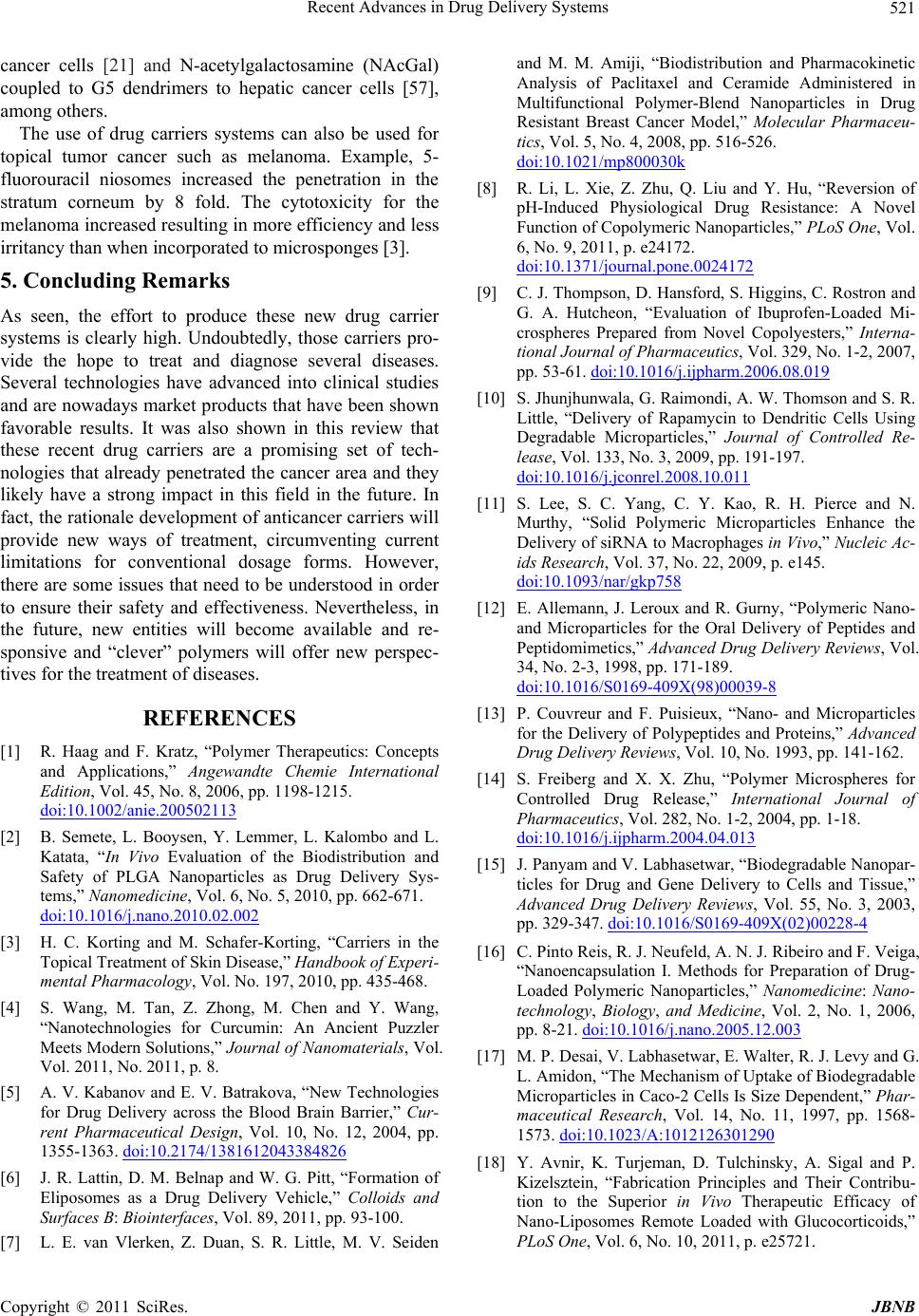 Recent Advances in Drug Delivery Systems521 cancer cells [21] and N-acetylgalactosamine (NAcGal) coupled to G5 dendrimers to hepatic cancer cells [57], among others. The use of drug carriers systems can also be used for topical tumor cancer such as melanoma. Example, 5- fluorouracil niosomes increased the penetration in the stratum corneum by 8 fold. The cytotoxicity for the melanoma increased resulting in more efficiency and less irritancy than when incorporated to microsponges [3]. 5. Concluding Remarks As seen, the effort to produce these new drug carrier systems is clearly high. Undoubtedly, those carriers pro- vide the hope to treat and diagnose several diseases. Several technologies have advanced into clinical studies and are nowadays market products that have been shown favorable results. It was also shown in this review that these recent drug carriers are a promising set of tech- nologies that already penetrated the cancer area and they likely have a strong impact in this field in the future. In fact, the rationale development of anticancer carriers will provide new ways of treatment, circumventing current limitations for conventional dosage forms. However, there are some issues that need to be understood in order to ensure their safety and effectiveness. Nevertheless, in the future, new entities will become available and re- sponsive and “clever” polymers will offer new perspec- tives for the treatment of diseases. REFERENCES [1] R. Haag and F. Kratz, “Polymer Therapeutics: Concepts and Applications,” Angewandte Chemie International Edition, Vol. 45, No. 8, 2006, pp. 1198-1215. doi:10.1002/anie.200502113 [2] B. Semete, L. Booysen, Y. Lemmer, L. Kalombo and L. Katata, “In Vivo Evaluation of the Biodistribution and Safety of PLGA Nanoparticles as Drug Delivery Sys- tems,” Nanomedicine, Vol. 6, No. 5, 2010, pp. 662-671. doi:10.1016/j.nano.2010.02.002 [3] H. C. Korting and M. Schafer-Korting, “Carriers in the Topical Treatment of Skin Disease,” Handbook of Experi- mental Pharmacology, Vol. No. 197, 2010, pp. 435-468. [4] S. Wang, M. Tan, Z. Zhong, M. Chen and Y. Wang, “Nanotechnologies for Curcumin: An Ancient Puzzler Meets Modern Solutions,” Journal of Nanomaterials, Vol. Vol. 2011, No. 2011, p. 8. [5] A. V. Kabanov and E. V. Batrakova, “New Technologies for Drug Delivery across the Blood Brain Barrier,” Cur- rent Pharmaceutical Design, Vol. 10, No. 12, 2004, pp. 1355-1363. doi:10.2174/1381612043384826 [6] J. R. Lattin, D. M. Belnap and W. G. Pitt, “Formation of Eliposomes as a Drug Delivery Vehicle,” Colloids and Surfaces B: Biointerfaces, Vol. 89, 2011, pp. 93-100. [7] L. E. van Vlerken, Z. Duan, S. R. Little, M. V. Seiden and M. M. Amiji, “Biodistribution and Pharmacokinetic Analysis of Paclitaxel and Ceramide Administered in Multifunctional Polymer-Blend Nanoparticles in Drug Resistant Breast Cancer Model,” Molecular Pharmaceu- tics, Vol. 5, No. 4, 2008, pp. 516-526. doi:10.1021/mp800030k [8] R. Li, L. Xie, Z. Zhu, Q. Liu and Y. Hu, “Reversion of pH-Induced Physiological Drug Resistance: A Novel Function of Copolymeric Nanoparticles,” PLoS One, Vol. 6, No. 9, 2011, p. e24172. doi:10.1371/journal.pone.0024172 [9] C. J. Thompson, D. Hansford, S. Higgins, C. Rostron and G. A. Hutcheon, “Evaluation of Ibuprofen-Loaded Mi- crospheres Prepared from Novel Copolyesters,” Interna- tional Journal of Pharmaceutics, Vol. 329, No. 1-2, 2007, pp. 53-61. doi:10.1016/j.ijpharm.2006.08.019 [10] S. Jhunjhunwala, G. Raimondi, A. W. Thomson and S. R. Little, “Delivery of Rapamycin to Dendritic Cells Using Degradable Microparticles,” Journal of Controlled Re- lease, Vol. 133, No. 3, 2009, pp. 191-197. doi:10.1016/j.jconrel.2008.10.011 [11] S. Lee, S. C. Yang, C. Y. Kao, R. H. Pierce and N. Murthy, “Solid Polymeric Microparticles Enhance the Delivery of siRNA to Macrophages in Vivo,” Nucleic Ac- ids Research, Vol. 37, No. 22, 2009, p. e145. doi:10.1093/nar/gkp758 [12] E. Allemann, J. Leroux and R. Gurny, “Polymeric Nano- and Microparticles for the Oral Delivery of Peptides and Peptidomimetics,” Advanced Drug Delivery Reviews, Vol. 34, No. 2-3, 1998, pp. 171-189. doi:10.1016/S0169-409X(98)00039-8 [13] P. Couvreur and F. Puisieux, “Nano- and Microparticles for the Delivery of Polypeptides and Proteins,” Advanced Drug Delivery Reviews, Vol. 10, No. 1993, pp. 141-162. [14] S. Freiberg and X. X. Zhu, “Polymer Microspheres for Controlled Drug Release,” International Journal of Pharmaceutics, Vol. 282, No. 1-2, 2004, pp. 1-18. doi:10.1016/j.ijpharm.2004.04.013 [15] J. Panyam and V. Labhasetwar, “Biodegradable Nanopar- ticles for Drug and Gene Delivery to Cells and Tissue,” Advanced Drug Delivery Reviews, Vol. 55, No. 3, 2003, pp. 329-347. doi:10.1016/S0169-409X(02)00228-4 [16] C. Pinto Reis, R. J. Neufeld, A. N. J. Ribeiro and F. Veiga, “Nanoencapsulation I. Methods for Preparation of Drug- Loaded Polymeric Nanoparticles,” Nanomedicine: Nano- technology, Biology, and Medicine, Vol. 2, No. 1, 2006, pp. 8-21. doi:10.1016/j.nano.2005.12.003 [17] M. P. Desai, V. Labhasetwar, E. Walter, R. J. Levy and G. L. Amidon, “The Mechanism of Uptake of Biodegradable Microparticles in Caco-2 Cells Is Size Dependent,” Phar- maceutical Research, Vol. 14, No. 11, 1997, pp. 1568- 1573. doi:10.1023/A:1012126301290 [18] Y. Avnir, K. Turjeman, D. Tulchinsky, A. Sigal and P. Kizelsztein, “Fabrication Principles and Their Contribu- tion to the Superior in Vivo Therapeutic Efficacy of Nano-Liposomes Remote Loaded with Glucocorticoids,” PLoS One, Vol. 6, No. 10, 2011, p. e25721. Copyright © 2011 SciRes. JBNB