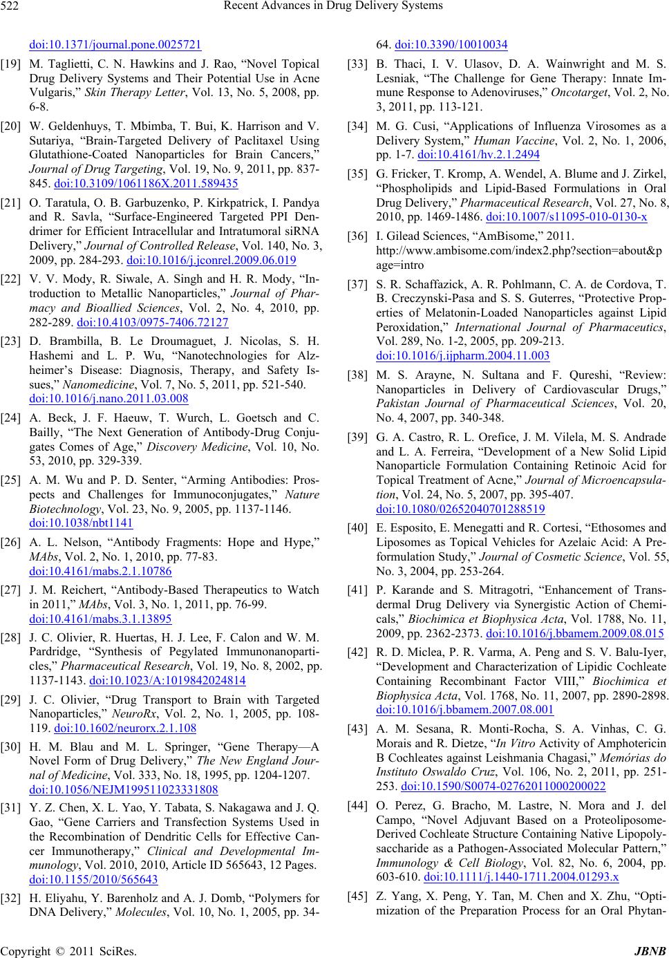 Recent Advances in Drug Delivery Systems 522 doi:10.1371/journal.pone.0025721 [19] M. Taglietti, C. N. Hawkins and J. Rao, “Novel Topical Drug Delivery Systems and Their Potential Use in Acne Vulgaris,” Skin Therapy Letter, Vol. 13, No. 5, 2008, pp. 6-8. [20] W. Geldenhuys, T. Mbimba, T. Bui, K. Harrison and V. Sutariya, “Brain-Targeted Delivery of Paclitaxel Using Glutathione-Coated Nanoparticles for Brain Cancers,” Journal of Drug Targeting, Vol. 19, No. 9, 2011, pp. 837- 845. doi:10.3109/1061186X.2011.589435 [21] O. Taratula, O. B. Garbuzenko, P. Kirkpatrick, I. Pandya and R. Savla, “Surface-Engineered Targeted PPI Den- drimer for Efficient Intracellular and Intratumoral siRNA Delivery,” Journal of Controlled Release, Vol. 140, No. 3, 2009, pp. 284-293. doi:10.1016/j.jconrel.2009.06.019 [22] V. V. Mody, R. Siwale, A. Singh and H. R. Mody, “In- troduction to Metallic Nanoparticles,” Journal of Phar- macy and Bioallied Sciences, Vol. 2, No. 4, 2010, pp. 282-289. doi:10.4103/0975-7406.72127 [23] D. Brambilla, B. Le Droumaguet, J. Nicolas, S. H. Hashemi and L. P. Wu, “Nanotechnologies for Alz- heimer’s Disease: Diagnosis, Therapy, and Safety Is- sues,” Nanomedicine, Vol. 7, No. 5, 2011, pp. 521-540. doi:10.1016/j.nano.2011.03.008 [24] A. Beck, J. F. Haeuw, T. Wurch, L. Goetsch and C. Bailly, “The Next Generation of Antibody-Drug Conju- gates Comes of Age,” Discovery Medicine, Vol. 10, No. 53, 2010, pp. 329-339. [25] A. M. Wu and P. D. Senter, “Arming Antibodies: Pros- pects and Challenges for Immunoconjugates,” Nature Biotechnology, Vol. 23, No. 9, 2005, pp. 1137-1146. doi:10.1038/nbt1141 [26] A. L. Nelson, “Antibody Fragments: Hope and Hype,” MAbs, Vol. 2, No. 1, 2010, pp. 77-83. doi:10.4161/mabs.2.1.10786 [27] J. M. Reichert, “Antibody-Based Therapeutics to Watch in 2011,” MAbs, Vol. 3, No. 1, 2011, pp. 76-99. doi:10.4161/mabs.3.1.13895 [28] J. C. Olivier, R. Huertas, H. J. Lee, F. Calon and W. M. Pardridge, “Synthesis of Pegylated Immunonanoparti- cles,” Pharmaceutical Research, Vol. 19, No. 8, 2002, pp. 1137-1143. doi:10.1023/A:1019842024814 [29] J. C. Olivier, “Drug Transport to Brain with Targeted Nanoparticles,” NeuroRx, Vol. 2, No. 1, 2005, pp. 108- 119. doi:10.1602/neurorx.2.1.108 [30] H. M. Blau and M. L. Springer, “Gene Therapy—A Novel Form of Drug Delivery,” The New England Jour- nal of Medicine, Vol. 333, No. 18, 1995, pp. 1204-1207. doi:10.1056/NEJM199511023331808 [31] Y. Z. Chen, X. L. Yao, Y. Tabata, S. Nakagawa a nd J. Q. Gao, “Gene Carriers and Transfection Systems Used in the Recombination of Dendritic Cells for Effective Can- cer Immunotherapy,” Clinical and Developmental Im- munology, Vol. 2010, 2010, Article ID 565643, 12 Pages. doi:10.1155/2010/565643 [32] H. Eliyahu, Y. Barenholz and A. J. Domb, “Polymers for DNA Delivery,” Molecules, Vol. 10, No. 1, 2005, pp. 34- 64. doi:10.3390/10010034 [33] B. Thaci, I. V. Ulasov, D. A. Wainwright and M. S. Lesniak, “The Challenge for Gene Therapy: Innate Im- mune Response to Adenoviruses,” Oncotarget, Vol. 2, No. 3, 2011, pp. 113-121. [34] M. G. Cusi, “Applications of Influenza Virosomes as a Delivery System,” Human Vaccine, Vol. 2, No. 1, 2006, pp. 1-7. doi:10.4161/hv.2.1.2494 [35] G. Fricker, T. Kromp, A. Wendel, A. Blume and J. Zirkel, “Phospholipids and Lipid-Based Formulations in Oral Drug Delivery,” Pharmaceutical Research, Vol. 27, No. 8, 2010, pp. 1469-1486. doi:10.1007/s11095-010-0130-x [36] I. Gilead Sciences, “AmBisome,” 2011. http://www.ambisome.com/index2.php?section=about&p age=intro [37] S. R. Schaffazick, A. R. Pohlmann, C. A. de Cordova, T. B. Creczynski-Pasa and S. S. Guterres, “Protective Prop- erties of Melatonin-Loaded Nanoparticles against Lipid Peroxidation,” International Journal of Pharmaceutics, Vol. 289, No. 1-2, 2005, pp. 209-213. doi:10.1016/j.ijpharm.2004.11.003 [38] M. S. Arayne, N. Sultana and F. Qureshi, “Review: Nanoparticles in Delivery of Cardiovascular Drugs,” Pakistan Journal of Pharmaceutical Sciences, Vol. 20, No. 4, 2007, pp. 340-348. [39] G. A. Castro, R. L. Orefice, J. M. Vilela, M. S. Andrade and L. A. Ferreira, “Development of a New Solid Lipid Nanoparticle Formulation Containing Retinoic Acid for Topical Treatment of Acne,” Journal of Microencapsula- tion, Vol. 24, No. 5, 2007, pp. 395-407. doi:10.1080/02652040701288519 [40] E. Esposito, E. Menegatti and R. Cortesi, “Ethosomes and Liposomes as Topical Vehicles for Azelaic Acid: A Pre- formul atio n Study, ” Journal of Cosmetic Science, Vol. 55, No. 3, 2004, pp. 253-264. [41] P. Karande and S. Mitragotri, “Enhancement of Trans- dermal Drug Delivery via Synergistic Action of Chemi- cals,” Biochimica et Biophysica Acta, Vol. 1788, No. 11, 2009, pp. 2362-2373. doi:10.1016/j.bbamem.2009.08.015 [42] R. D. Miclea, P. R. Varma, A. Peng and S. V. Balu-Iyer, “Development and Characterization of Lipidic Cochleate Containing Recombinant Factor VIII,” Biochimica et Biophysica Acta, Vol. 1768, No. 11, 2007, pp. 2890-2898. doi:10.1016/j.bbamem.2007.08.001 [43] A. M. Sesana, R. Monti-Rocha, S. A. Vinhas, C. G. Morais and R. Dietze, “In Vitro Activity of Amphotericin B Cochleates against Leishmania Chagasi,” Memórias do Instituto Oswaldo Cruz, Vol. 106, No. 2, 2011, pp. 251- 253. doi:10.1590/S0074-02762011000200022 [44] O. Perez, G. Bracho, M. Lastre, N. Mora and J. del Campo, “Novel Adjuvant Based on a Proteoliposome- Derived Cochleate Structure Containing Native Lipopoly- saccharide as a Pathogen-Associated Molecular Pattern,” Immunology & Cell Biology, Vol. 82, No. 6, 2004, pp. 603-610. doi:10.1111/j.1440-1711.2004.01293.x [45] Z. Yang, X. Peng, Y. Tan, M. Chen and X. Zhu, “Opti- mization of the Preparation Process for an Oral Phytan- Copyright © 2011 SciRes. JBNB