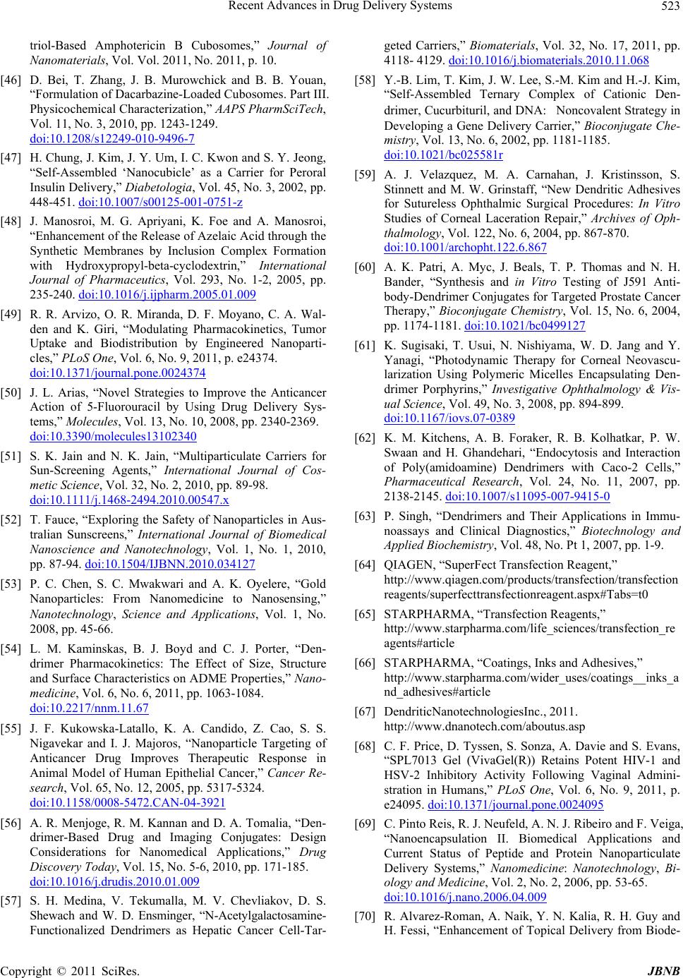 Recent Advances in Drug Delivery Systems523 triol-Based Amphotericin B Cubosomes,” Journal of Nanomaterials, Vol. Vol. 2011, No. 2011, p. 10. [46] D. Bei, T. Zhang, J. B. Murowchick and B. B. Youan, “Formulation of Dacarbazine-Loaded Cubosomes. Part III. Physicochemical Characterization,” AAPS PharmSciTech, Vol. 11, No. 3, 2010, pp. 1243-1249. doi:10.1208/s12249-010-9496-7 [47] H. Chung, J. Kim, J. Y. Um, I. C. Kwon and S. Y. Jeong, “Self-Assembled ‘Nanocubicle’ as a Carrier for Peroral Insulin Delivery,” Diabetologia, Vol. 45, No. 3, 2002, pp. 448-451. doi:10.1007/s00125-001-0751-z [48] J. Manosroi, M. G. Apriyani, K. Foe and A. Manosroi, “Enhancement of the Release of Azelaic Acid through the Synthetic Membranes by Inclusion Complex Formation with Hydroxypropyl-beta-cyclodextrin,” International Journal of Pharmaceutics, Vol. 293, No. 1-2, 2005, pp. 235-240. doi:10.1016/j.ijpharm.2005.01.009 [49] R. R. Arvizo, O. R. Miranda, D. F. Moyano, C. A. Wal- den and K. Giri, “Modulating Pharmacokinetics, Tumor Uptake and Biodistribution by Engineered Nanoparti- cles,” PLoS One, Vol. 6, No. 9, 2011, p. e24374. doi:10.1371/journal.pone.0024374 [50] J. L. Arias, “Novel Strategies to Improve the Anticancer Action of 5-Fluorouracil by Using Drug Delivery Sys- tems,” Molecules, Vol. 13, No. 10, 2008, pp. 2340-2369. doi:10.3390/molecules13102340 [51] S. K. Jain and N. K. Jain, “Multiparticulate Carriers for Sun-Screening Agents,” International Journal of Cos- metic Science, Vol. 32, No. 2, 2010, pp. 89-98. doi:10.1111/j.1468-2494.2010.00547.x [52] T. Fauce, “Exploring the Safety of Nanoparticles in Aus- tralian Sunscreens,” International Journal of Biomedical Nanoscience and Nanotechnology, Vol. 1, No. 1, 2010, pp. 87-94. doi:10.1504/IJBNN.2010.034127 [53] P. C. Chen, S. C. Mwakwari and A. K. Oyelere, “Gold Nanoparticles: From Nanomedicine to Nanosensing,” Nanotechnology, Science and Applications, Vol. 1, No. 2008, pp. 45-66. [54] L. M. Kaminskas, B. J. Boyd and C. J. Porter, “Den- drimer Pharmacokinetics: The Effect of Size, Structure and Surface Characteristics on ADME Properties,” Nano- medicine, Vol. 6, No. 6, 2011, pp. 1063-1084. doi:10.2217/nnm.11.67 [55] J. F. Kukowska-Latallo, K. A. Candido, Z. Cao, S. S. Nigavekar and I. J. Majoros, “Nanoparticle Targeting of Anticancer Drug Improves Therapeutic Response in Animal Model of Human Epithelial Cancer,” Cancer Re- search, Vol. 65, No. 12, 2005, pp. 5317-5324. doi:10.1158/0008-5472.CAN-04-3921 [56] A. R. Menjoge, R. M. Kannan and D. A. Tomalia, “Den- drimer-Based Drug and Imaging Conjugates: Design Considerations for Nanomedical Applications,” Drug Discovery Today, Vol. 15, No. 5-6, 2010, pp. 171-185. doi:10.1016/j.drudis.2010.01.009 [57] S. H. Medina, V. Tekumalla, M. V. Chevliakov, D. S. Shewach and W. D. Ensminger, “N-Acetylgalactosamine- Functionalized Dendrimers as Hepatic Cancer Cell-Tar- geted Carriers,” Biomaterials, Vol. 32, No. 17, 2011, pp. 4118- 4129. doi:10.1016/j.biomaterials.2010.11.068 [58] Y.-B. Lim, T. Kim, J. W. Lee, S.-M. Kim and H.-J. Kim, “Self-Assembled Ternary Complex of Cationic Den- drimer, Cucurbituril, and DNA: Noncovalent Strategy in Developing a Gene Delivery Carrier,” Bioconjugate Che- mistry, Vol. 13, No. 6, 2002, pp. 1181-1185. doi:10.1021/bc025581r [59] A. J. Velazquez, M. A. Carnahan, J. Kristinsson, S. Stinnett and M. W. Grinstaff, “New Dendritic Adhesives for Sutureless Ophthalmic Surgical Procedures: In Vitro Studies of Corneal Laceration Repair,” Archives of Oph- thalmology, Vol. 122, No. 6, 2004, pp. 867-870. doi:10.1001/archopht.122.6.867 [60] A. K. Patri, A. Myc, J. Beals, T. P. Thomas and N. H. Bander, “Synthesis and in Vitro Testing of J591 Anti- body-Dendrimer Conjugates for Targeted Prostate Cancer Therapy,” Bioconjugate Chemistry, Vol. 15, No. 6, 2004, pp. 1174-1181. doi:10.1021/bc0499127 [61] K. Sugisaki, T. Usui, N. Nishiyama, W. D. Jang and Y. Yanagi, “Photodynamic Therapy for Corneal Neovascu- larization Using Polymeric Micelles Encapsulating Den- drimer Porphyrins,” Investigative Ophthalmology & Vis- ual Science, Vol. 49, No. 3, 2008, pp. 894-899. doi:10.1167/iovs.07-0389 [62] K. M. Kitchens, A. B. Foraker, R. B. Kolhatkar, P. W. Swaan and H. Ghandehari, “Endocytosis and Interaction of Poly(amidoamine) Dendrimers with Caco-2 Cells,” Pharmaceutical Research, Vol. 24, No. 11, 2007, pp. 2138-2145. doi:10.1007/s11095-007-9415-0 [63] P. Singh, “Dendrimers and Their Applications in Immu- noassays and Clinical Diagnostics,” Biotechnology and Applied Biochemistry, Vol. 48, No. Pt 1, 2007, pp. 1-9. [64] QIAGEN, “SuperFect Transfection Reagent,” http://www.qiagen.com/products/transfection/transfection reagents/superfecttransfectionreagent.aspx#Tabs=t0 [65] STARPHARMA, “Transfection Reagents,” http://www.starpharma.com/life_sciences/transfection_re agents#article [66] STARPHARMA, “Coatings, Inks and Adhesives,” http://www.starpharma.com/wider_uses/coatings__inks_a nd_adhesives#article [67] DendriticNanotech n ologiesInc., 2011. http://www.dnanotech.com/aboutus.asp [68] C. F. Price, D. Tyssen, S. Sonza, A. Davie and S. Evans, “SPL7013 Gel (VivaGel(R)) Retains Potent HIV-1 and HSV-2 Inhibitory Activity Following Vaginal Admini- stration in Humans,” PLoS One, Vol. 6, No. 9, 2011, p. e24095. doi:10.1371/journal.pone.0024095 [69] C. Pinto Reis, R. J. Neufeld, A. N. J. Ribeiro and F. Veiga, “Nanoencapsulation II. Biomedical Applications and Current Status of Peptide and Protein Nanoparticulate Delivery Systems,” Nanomedicine: Nanotechnology, Bi- ology and Medicine, Vol. 2, No. 2, 2006, pp. 53-65. doi:10.1016/j.nano.2006.04.009 [70] R. Alvarez-Roman, A. Naik, Y. N. Kalia, R. H. Guy and H. Fessi, “Enhancement of Topical Delivery from Biode- Copyright © 2011 SciRes. JBNB