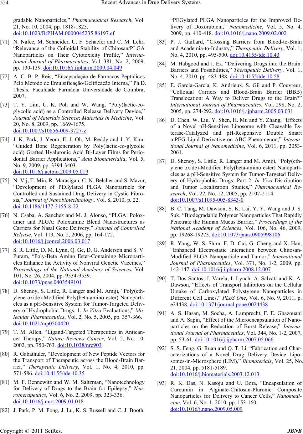 Recent Advances in Drug Delivery Systems 524 gradable Nanoparticles,” Pharmaceutical Research, Vol. 21, No. 10, 2004, pp. 1818-1825. doi:10.1023/B:PHAM.0000045235.86197.ef [71] N. Nafee, M. Schneider, U. F. Schaefer and C. M. Lehr, “Relevance of the Colloidal Stability of Chitosan/PLGA Nanoparticles on Their Cytotoxicity Profile,” Interna- tional Journal of Pharmaceutics, Vol. 381, No. 2, 2009, pp. 130-139. doi:10.1016/j.ijpharm.2009.04.049 [72] A. C. B. P. Reis, “Encapsulação de Fármacos Peptídicos Pelo Método de Emulsificação/Gelificação Interna,” Ph.D. Thesis, Faculdade Farmácia Universidade de Coimbra, 2007. [73] T. Y. Lim, C. K. Poh and W. Wang, “Poly(lactic-co- glycolic acid) as a Controlled Release Delivery Device,” Journal of Materials Science: Materials in Medicine, Vol. 20, No. 8, 2009, pp. 1669-1675. doi:10.1007/s10856-009-3727-z [74] J. K. Park, J. Yeom, E. J. Oh, M. Reddy and J. Y. Kim, “Guided Bone Regeneration by Poly(lactic-co-glycolic acid) Grafted Hyaluronic Acid Bi-Layer Films for Perio- dontal Barrier Applications,” Acta Biomaterialia, Vol. 5, No. 9, 2009, pp. 3394-3403. doi:10.1016/j.actbio.2009.05.019 [75] N. Vij, T. Min, R. Marasigan, C. N. Belcher and S. Mazur, “Development of PEGylated PLGA Nanoparticle for Controlled and Sustained Drug Delivery in Cystic Fibro- sis,” Journal of Nanobiotechnology, Vol. 8, 2010, p. 22. doi:10.1186/1477-3155-8-22 [76] N. Csaba, A. Sanchez and M. J. Alonso, “PLGA: Polox- amer and PLGA: Poloxamine Blend Nanostructures as Carriers for Nasal Gene Delivery,” Journal of Controlled Release, Vol. 113, No. 2, 2006, pp. 164-172. doi:10.1016/j.jconrel.2006.03.017 [77] S. R. Little, D. M. Lynn, Q. Ge, D. G. Anderson and S. V. Puram, “Poly-Beta Amino Ester-Containing Microparti- cles Enhance the Activity of Nonviral Genetic Vaccines,” Proceedings of the National Academy of Sciences, Vol. 101, No. 26, 2004, pp. 9534-9539. doi:10.1073/pnas.0403549101 [78] D. Shenoy, S. Little, R. Langer and M. Amiji, “Poly(eth- ylene oxide)-Modified Poly(beta-amino ester) Nanoparti- cles as a pH-Sensitive System for Tumor-Targeted Deliv- ery of Hydrophobic Drugs. 1. In Vitro Evaluations,” Mo- lecular Pharmaceutics, Vol. 2, No. 5, 2005, pp. 357-366. doi:10.1021/mp0500420 [79] T. M. Allen, “Ligand-Targeted Therapeutics in Antican- cer Therapy,” Nature Reviews Cancer, Vol. 2, No. 10, 2002, pp. 750-763. doi:10.1038/nrc903 [80] R. Gabathuler, “Development of New Peptide Vectors for the Transport of Therapeutic across the Blood-Brain Bar- rier,” Therapeutic Delivery, Vol. 1, No. 4, 2010, pp. 571-586. doi:10.4155/tde.10.35 [81] M. F. Bennewitz and W. M. Saltzman, “Nanotechnology for Delivery of Drugs to the Brain for Epilepsy,” Neu- rotherapeutics, Vol. 6, No. 2, 2009, pp. 323-336. doi:10.1016/j.nurt.2009.01.018 [82] J. Park, P. M. Fong, J. Lu, K. S. Russell and C. J. Booth, “PEGylated PLGA Nanoparticles for the Improved De- livery of Doxorubicin,” Nanomedicine, Vol. 5, No. 4, 2009, pp. 410-418. doi:10.1016/j.nano.2009.02.002 [83] P. J. Gaillard, “Crossing Barriers from Blood-to-Brain and Academia-to-Industry,” Therapeutic Delivery, Vol. 1, No. 4, 2010, pp. 495-500. doi:10.4155/tde.10.43 [84] M. Habgood and J. Ek, “Delivering Drugs into the Brain: Barriers and Possibilities,” Therapeutic Delivery, Vol. 1, No. 4, 2010, pp. 483-488. doi:10.4155/tde.10.58 [85] E. Garcia-Garcia, K. Andrieux, S. Gil and P. Couvreur, “Colloidal Carriers and Blood-Brain Barrier (BBB) Translocation: A Way to Deliver Drugs to the Brain?” International Journal of Pharmaceutics, Vol. 298, No. 2, 2005, pp. 274-292. doi:10.1016/j.ijpharm.2005.03.031 [86] D. Chen, W. Liu, Y. Shen, H. Mu and Y. Zhang, “Effects of a Novel pH-Sensitive Liposome with Cleavable Es- terase-Catalyzed and pH-Responsive Double Smart mPEG Lipid Derivative on ABC Phenomenon,” Interna- tional Journal of Nanomedicine, Vol. 6, 2011, pp. 2053- 2061. [87] D. Shenoy, S. Little, R. Langer and M. Amiji, “Poly(eth- ylene oxide)-Modified Poly(beta-amino ester) Nanoparti- cles as a pH-Sensitive System for Tumor-Targeted Deliv- ery of Hydrophobic Drugs: Part 2. In Vivo Distribution and Tumor Localization Studies,” Pharmaceutical Re- search, Vol. 22, No. 12, 2005, pp. 2107-2114. doi:10.1007/s11095-005-8343-0 [88] B. C. Tang, M. Dawson, S. K. Lai, Y. Y. Wang and J. S. Suk, “Biodegradable Polymer Nanoparticles That Rapidly Penetrate the Human Mucus Barrier,” Proceedings of the National Academy of Sciences, Vol. 106, No. 46, 2009, pp. 19268-19273. doi:10.1073/pnas.0905998106 [89] R. Yang, W. S. Shim, F. D. Cui, G. Cheng and X. Han, “Enhanced Electrostatic Interaction between Chitosan- Modified PLGA Nanoparticle and Tumor,” International Journal of Pharmaceutics, Vol. 371, No. 1-2, 2009, pp. 142-147. doi:10.1016/j.ijpharm.2008.12.007 [90] T. Dos Santos, J. Varela, I. Lynch, A. Salvati and K. A. Dawson, “Effects of Transport Inhibitors on the Cellular Uptake of Carboxylated Polystyrene Nanoparticles in Different Cell Lines,” PLoS One, Vol. 6, No. 9, 2011, p. e24438. doi:10.1371/journal.pone.0024438 [91] A. S. Hasan, M. Socha, A. Lamprecht, F. E. Ghazouani and A. Sapin, “Effect of the Microencapsulation of Nano- particles on the Reduction of Burst Release,” Interna- tional Journal of Pharmaceutics, Vol. 344, No. 1-2, 2007, pp. 53-61. doi:10.1016/j.ijpharm.2007.05.066 [92] S. S. Feng, G. Ruan and Q. T. Li, “Fabrication and Char- acterizations of a Novel Drug Delivery Device Lipo- somes-in-Microsphere (LIM),” Biomaterials, Vol. 25, No. 21, 2004, pp. 5181-5189. doi:10.1016/j.biomaterials.2003.12.013 [93] R. K. Das, N. Kasoju and U. Bora, “Encapsulation of Curcumin in Alginate-Chitosan-Pluronic Composite Nanoparticles for Delivery to Cancer Cells,” Nanomedi- cine, Vol. 6, No. 1, 2010, pp. 153-160. doi:10.1016/j.nano.2009.05.009 Copyright © 2011 SciRes. JBNB