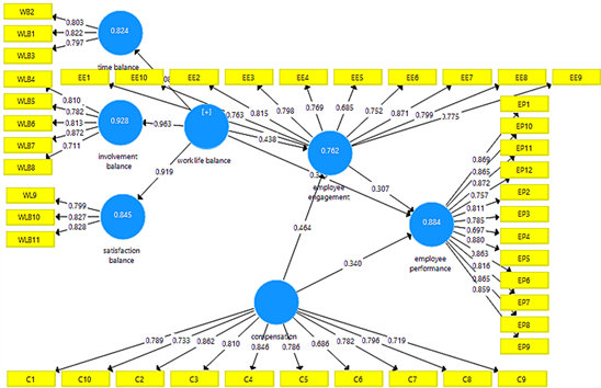 The value of convergent validity and discriminant validity can be known through the value of Average Variance Extracted (AVE) which is >0.5 (Hair et al., 2013). The results in Table 3 stated that the AVE value of each dimension of the work-life balance variable (time balance, involvement balance, satisfaction balance) was more than 0.5. The AVE value of the work-life balance, compensation, employee engagement and employee performance variables has been more than 0.5.