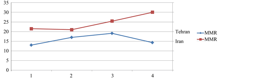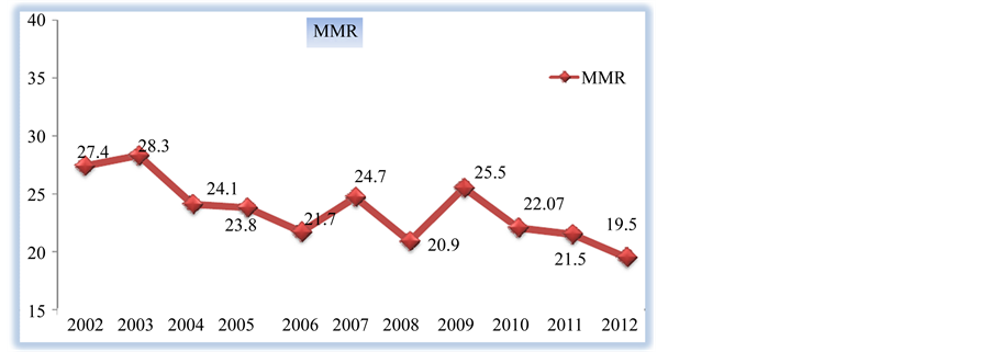 Improvement in the health status of mothers following the decrease in poverty has been considered as one of the prerequisites of development. To measure maternal mortality rate, an indicator named Maternal Mortality Ration (MMR) is used, showing the rate of maternal mortality due to complications of pregnancy and delivery per 100,000 live deliveries (Figure 1). The indicator MMR shows the women general health status in the society [2] . Investment on the better health status of mothers not only improves the health status of the mother and her family but also increases the number of working women, considering workforce, and so the economic state of the society and country. Untreated delivery and pregnancy complications cause 10 - 20 million women yearly to lose the ability to support themselves and their families [3] .