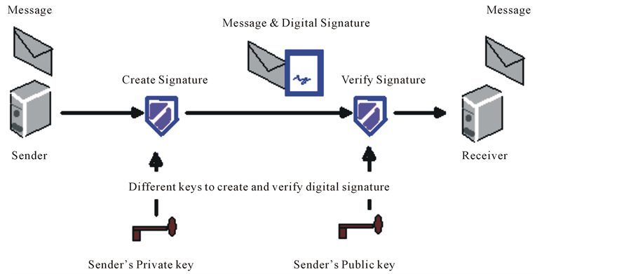 Hash algorithms function by converting data of random length into a smaller fixed length, this is commonly known as a message digest [12] -[14] . These types of algorithms are considered one-way functions. The generated output varies, making them very efficient when it comes to detecting alterations that might have been made to a message. Hash algorithms are often generated by the DES algorithm to encrypt online banking transactions and other communications where messages can't afford to be corrupted. In Figure 7, the public key is available although it can be distributed alongside the message, although the private key is secret and it is never included in the message. A digital signature it created and is verified by the asymmetric public/private key pair for authentication purposed. Then the sender signs the message content and adds his private key to the message and sends the message with the digital signature that was created earlier to the corresponding receiver or recipient. The digital signature is verified by the receiver with the sender’s public key.