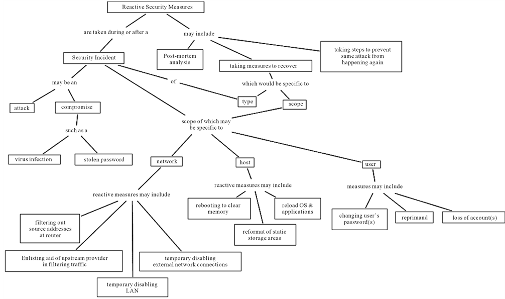 The reactive security measures are different from that of the proactive security measures; this is because the reactive measures are deployed after or during an attack. From Figure 9, the reactive security measures system is responsible for; security incident, post-mortem analysis, recovery measure, taking steps to prevent same attack from happening again [28] -[30] .