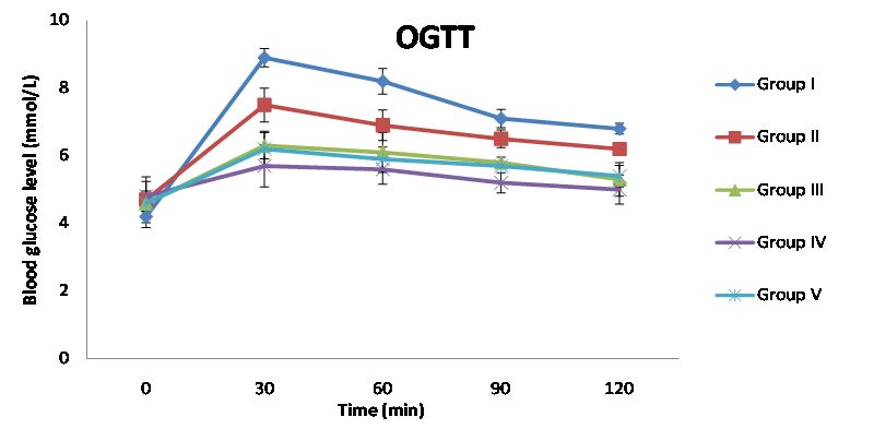 Oral glucose tolerance test was performed in overnight (18 h) starved normal Long-Evans rat. The rats were randomly divided into five groups, each consisting of five rats (n = 5).