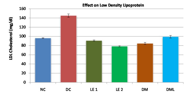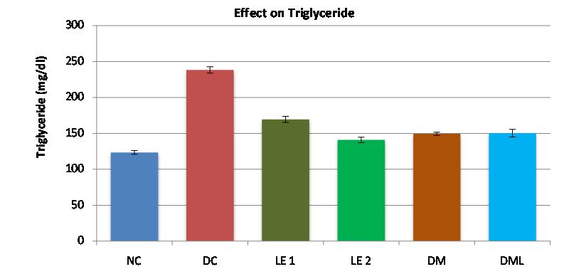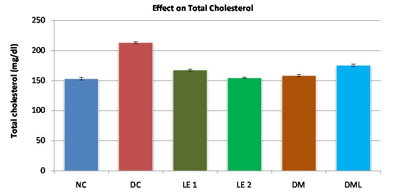 Leaf extract, Metformin and the combination of (leaf extract & Metformin) were administered daily for four weeks in the alloxan-induced diabetic rats. After completing drug treatment for 28 days serum was collected and the concentration of TC, TG, LDL and HDL Cholesterol were measured by taking absorbance by UV spectrophotometer using diagnostic kits (LINEAR CHEMICALS, Spain). The ratio of LDL to HDL cholesterol was calculated.