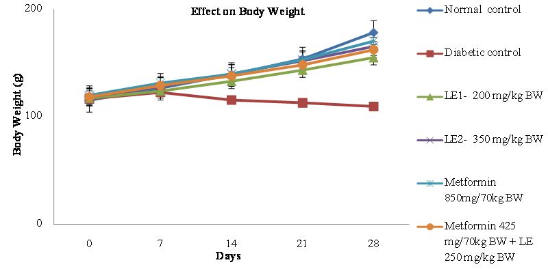 In the present study, in comparison with normal rats alloxan induced diabetic rats showed significant (P < 0.01) reduction in body weight. At the end of 28 days treatment, the body weight of normal rats, diabetic control, different doses of methanolic leaf extract and metformin treated rats were observed (Table 4 & Figure 8). After four weeks treatment with methanolic leaf extract of S. japonica