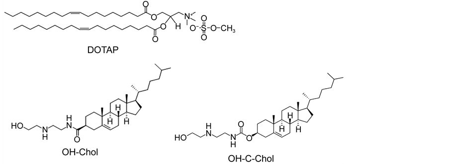 1,2-Dioleoyl-3-trimethylammonium-propane (DOTAP) methyl sulfate salt (Figure 1) was obtained from Avanti Polar Lipids Inc. (Alabaster, AL, USA). Cholesterol (Chol) was purchased from Wako Pure Chemical Industries, Ltd. (Osaka, Japan). N-(2-(2-Hydroxyethylamino)ethyl)cholesteryl-3-carboxamide (OH-Chol) (Figure 1) and cholesteryl (2-((2-hydroxyethyl)amino)ethyl)carba- mate (OH-C-Chol) (Figure 1) were synthesized as described previously [11] . 1,2-Dioleoyl-sn-glycero-3-phosphoethanolamine (DOPE) was obtained from NOF Co. Ltd. (Tokyo, Japan). All other chemicals were of the finest grade available.