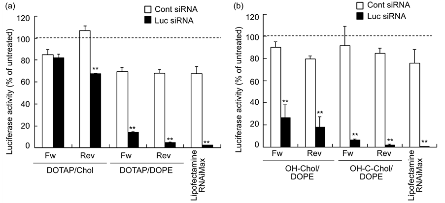 Figure 3. Effect of transfection method on gene silencing activity in MCF-7-Luc cells 48 h after transfection. (a) DOTAP/Chol and DOTAP/DOPE lipoplexes were transfected into the cells using the Fw-transfection or Rev- transfection methods. (b) OH-Chol/DOPE and OH-C-Chol/DOPE lipoplexes were transfected into the cells by Fw-transfection or Rev-transfection methods. These lipoplexes were added to cells with 50 nM small interfering RNA (siRNA). Commercially available transfection reagent Lipofectamine RNAiMax was used as a control. Each column represents the mean ± S.D. (n = 3). **p < 0.01 compared with control (Cont) siRNA.