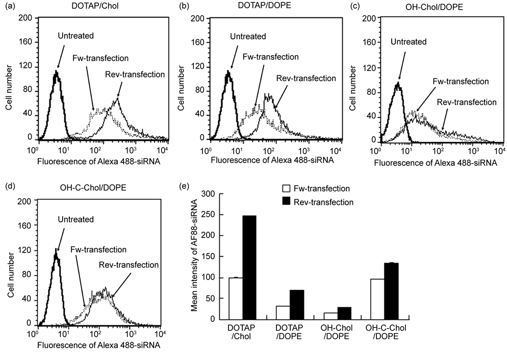 Figure 4. Cellular association at 3 h after Fw-transfection or Rev-transfection of siRNA lipoplexes. (a) DOTAP/Chol lipoplexes, (b) DOTAP/DOPE lipoplexes, (c) OH-Chol/DOPE lipoplexes, and (d) OH-C-Chol/DOPE lipoplexes were formed by mixing with Alexa Fluor®488-labeled small interfering RNA (AF-siRNA). These lipoplexes were added to cells with a final concentration of 50 nM siRNA. The association of siRNA lipoplexes with MCF-7 cells was determined on the basis of Alexa Fluor®488-fluorescence by flow cytometry. (e) Each column represents the mean fluorescent intensity ± S.D. (n = 3).