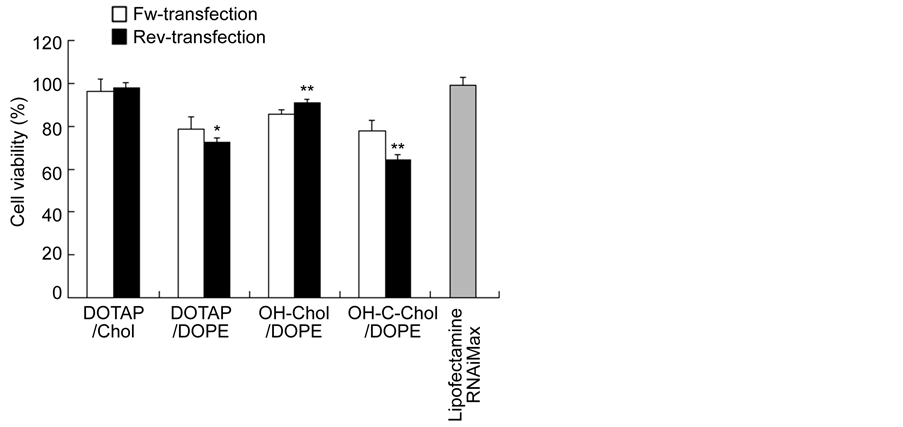 First, we prepared DOTAP-based and cationic cholesterol derivative-based liposomes for siRNA delivery by Fw- and Rev-transfections, respectively. In this study, we used DOTAP, OH-Chol, or OH-C-Chol (Figure 1) as a cationic lipid, and DOPE or Chol as a neutral lipid. Because we reported previously that cationic liposomes composed of OH-Chol or OH-C-Chol and DOPE could efficiently deliver siRNA into tumor cells [11] [14] . In the formulations with DOTAP- based liposomes, cationic liposomes composed of DOTAP and cholesterol (Chol) or DOPE were prepared, because their formulations were often used for siRNA delivery [12] [15] [16] . The sizes of DOTAP/Chol, DOTAP/DOPE, OH-Chol/ DOPE, and OH-C-Chol/DOPE liposomes were approximately 100 - 130 nm, and their ζ-potentials were 47 - 56 mV (Table 1). When the lipoplexes were prepared with siRNA, their sizes were approximately 190 - 220 nm and their ζ-potentials were about 42 - 47 mV.