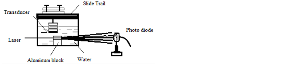 A glass tank sized 80 × 60 × 60 mm and filled of pure water in depth of 2/3 the tank is taken as the acousto optical cell. The transducer-head with heat radiator sat on an adjustable mechanism which can be slide along the trail mounted on the upper frame of the water tank, see Figure 1. The head is inserted uprightly into the water. The transducer sized 20 × 10 × 0.2 mm3, which is driven by the homemade ultrasonic generator. (The largest acoustic power to be fed into the transducer is about 5 watts) The ration of standing wave is less than 1:1.2. A He-Ne laser (632.8 nm) and a CW Nd: YAG/KTP laser (532 nm) are employed as the light sources. The incidence is adjusted to be 3 - 5 mm beneath the transducer.