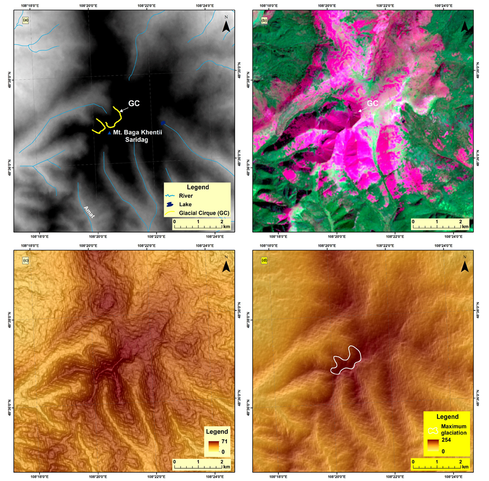 Figure 6. Mt. Baga Khentii Saridag: (a) Glacial landforms and a grey-scale AGDEM, (b) False Landsat 8 imagery, (c) Colored AGDEM draped by a semi-transparent grey-scaleslope model, and (d) Colored AGDEM draped by a semi-transparent grey-scalehill shade model with the maximum paleoglacier reconstruction.