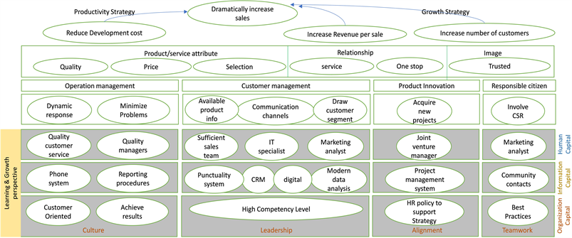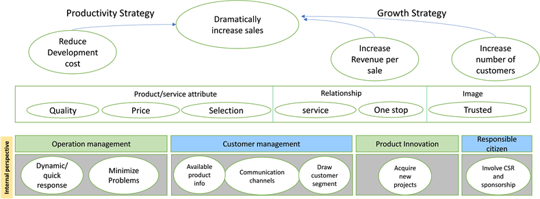 The strategy map is normally initiated from the financial goals, defining the stretch target, and allocating the growth and productivity factors of financial sub-objective measure, indicating cause and effect factors parameters. The organisation as a real estate competitive developer who is acting aggressively in the market, are aiming to dramatically increase sales for the purpose of their profitability and increased market share.