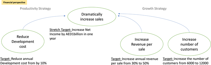 The stretch target is to increase net income by AED 1,000,000,000 by the next year. Accordingly, the sub-objectives for both productivity and growth are set too, which are; reduce development cost, increase revenue per sale and an increasing number of customers. Figure 8 shows the BSC financial map of EK04.