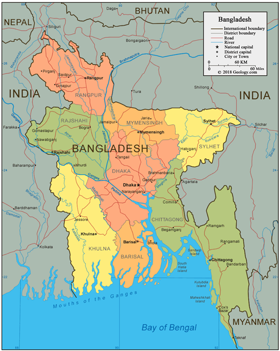Bangladesh is a South Asian country that is bordered by India on the West and North and Myanmar on the East. The Southern border faces the Bay of Bengal (Figure 1). Bangladesh, which won its independence as a separate sovereign nation from Pakistan in 1971, is the eighth most populated country in the world and is the most densely populated country in the world (UN, 2017c) . Cox’s Bazar, the district where Rohingyas has resettled, is one of the most impoverished regions of Bangladesh, already struggling to cope with extreme poverty, high population density, and the effects of regular natural disasters and climate change (Kiragu et al., 2011) .