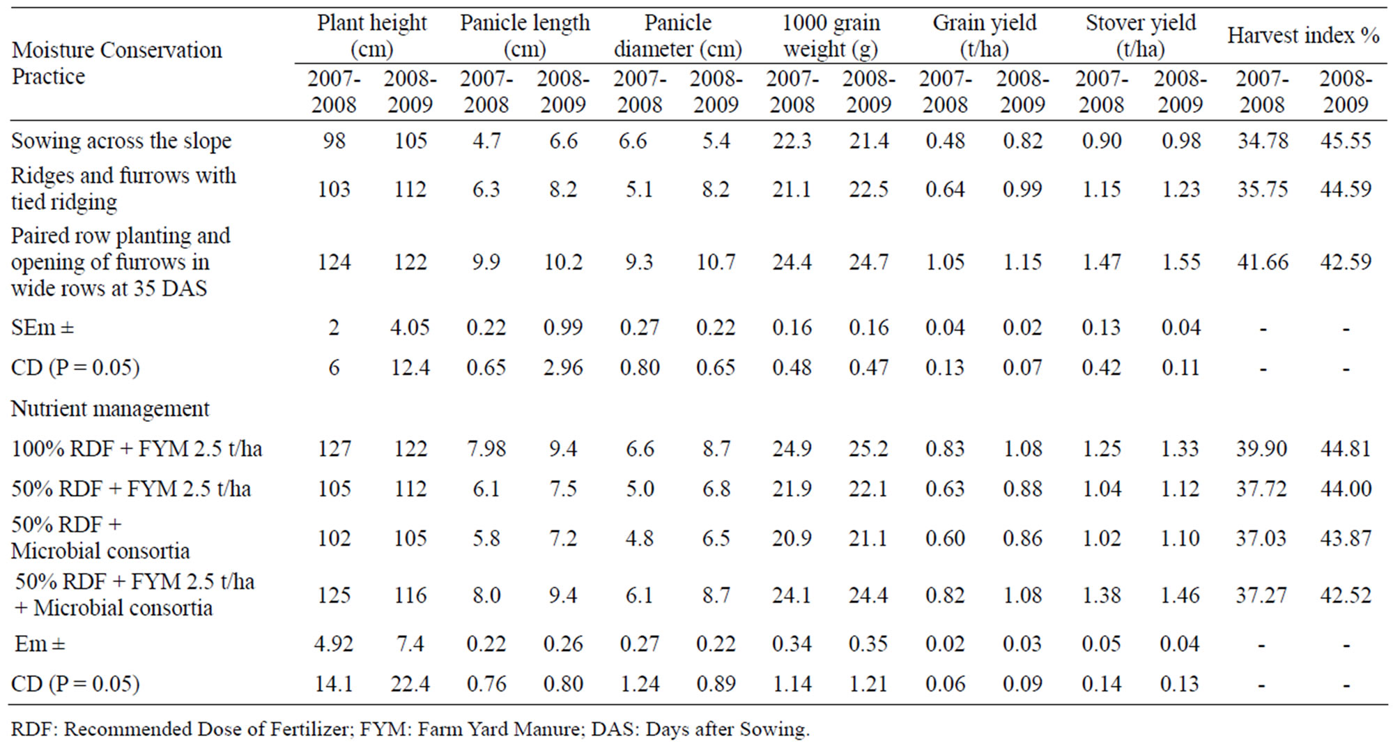 increased water holding capacity of the soil. The results are in conformity with findings of Pacharne et al. [7]. Pooled data indicated that tied ridging and paired row planting recorded significantly higher panicle diameter (6.7 and 10 cm) and 1000 grain weight (21.8 and 24.6 g) during 2007-2008 and 2008-2009 respectively over sowing across the slope. The higher yield and yield components in moisture conservation treatments could be attributed to vigorous crop growth resulting from increased availability of soil moisture. Das and Goutham [8] reported similar results in pearl millet. The harvest index ranged from 39.90 under 50% RDF + FYM 2.5 t/ha, 50% RDF + Microbial consortia to 42.36 under 100% RDF + FYM 2.5 t/ha. Paired row planting and opening of furrow in wide rows at 35 DAS recorded numerically higher harvest index of 42.12 among different moisture conservation treatments.