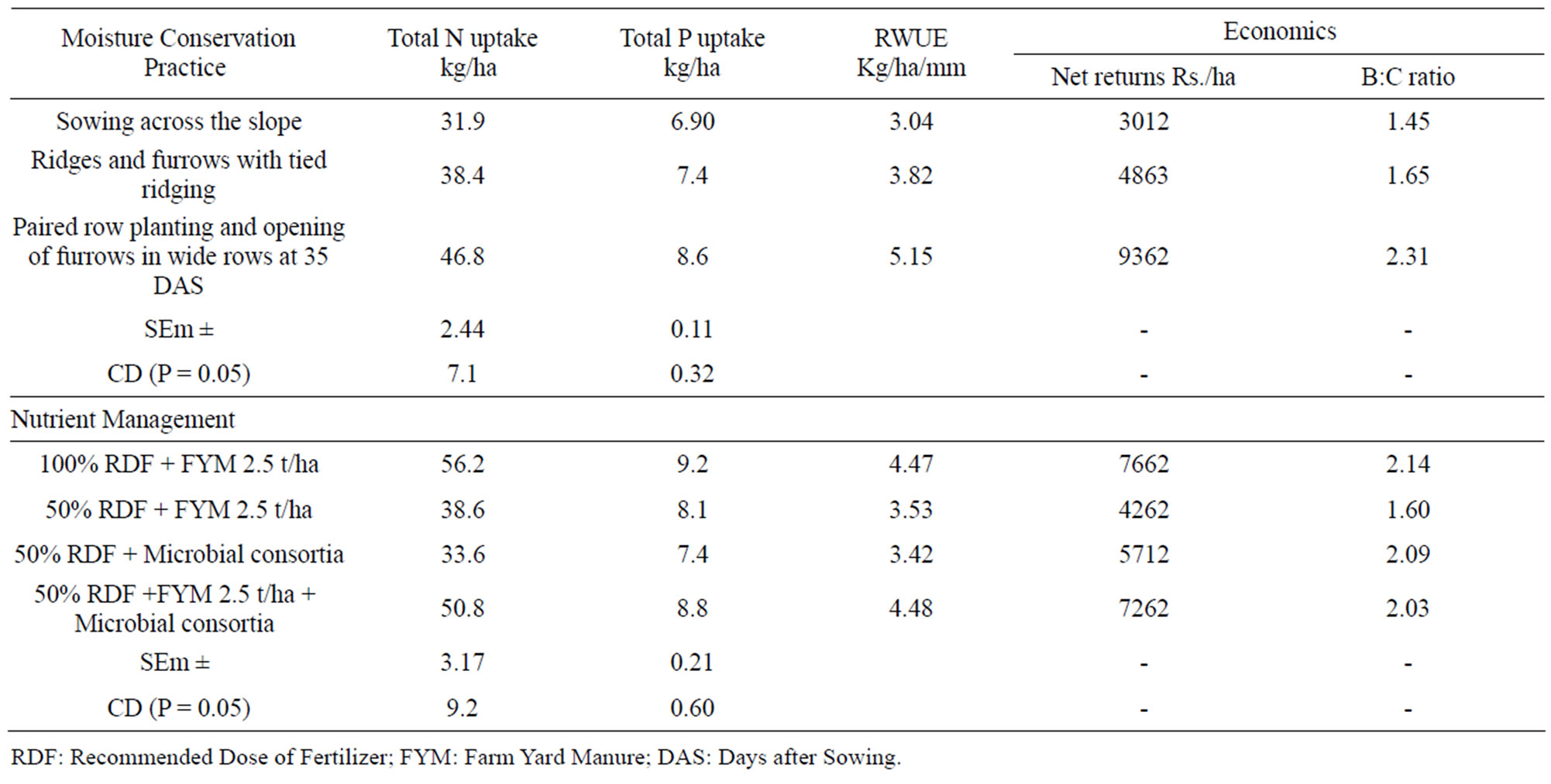 Uptake of N and P varied significantly due to different treatments. Paired row planting recorded significantly higher N (46.8 kg/ha) and P (8.6 kg/ha) uptake over other treatments (Table 3). Similarly, RDF + FYM recorded significantly higher N and P uptake but on par with 50% RDF + FYM + Microbial consortia. Similar results were reported by Rathore et al. [10]. The increased uptake of N and P under these treatments could be attributed to higher grain and stover yields, apparently because of increased availability of water to the plants. Adequate supply of moisture in general is known to influence positively on the growth and dry matter production of crop directly as well as indirectly by increasing the availability and utilization of nutrient.