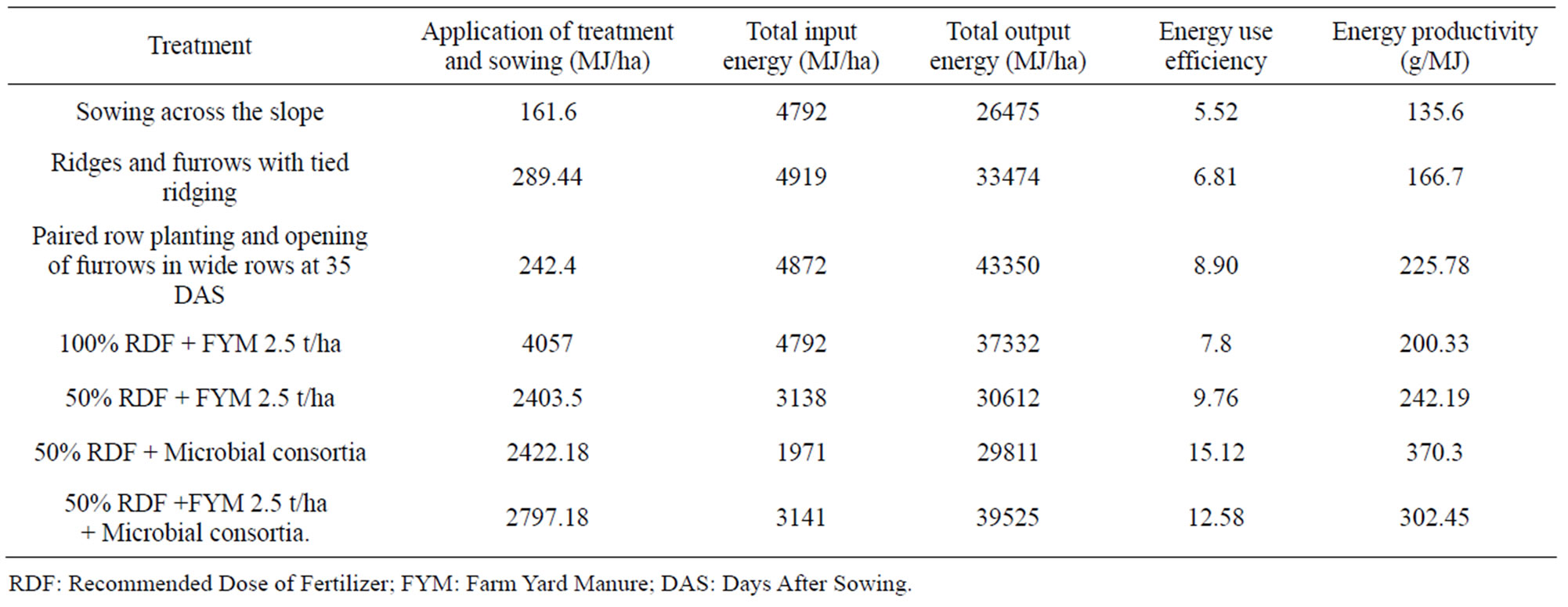 Among different operations fertilizers and manure contributed about 84% and harvesting and processing contributed about 6.5% to total input energy in rabi sorghum. The harvested grain and fodder yields obtained under different treatments were converted to output energy (MJ/ha). The results indicated that maximum output energy of 43,350 MJ/ha was attained under paired row planting and opening of furrow in wide rows at 35DAS. Similarly application of 50% fertilizer along with FYM and microbial consortia recorded output energy of 39,525 MJ/ha. The lowest output energy 26,475 MJ/ha was attained under sowing across the slope was mainly due to lower grain and stover yield obtained in both the years. Among different moisture conservation treatments paired row planting and opening of furrows in wide rows at 35 DAS gave highest energy use efficiency of 8.90 and energy productivity of 225.78 g/MJ. Among different nutrient management practices 50% RDF microbial consortia recorded highest energy use efficiency of 15.12 and energy productivity of 370.3 g/MJ followed by 50% RDF + FYM 2.5 t/ha + application of FYM in the above