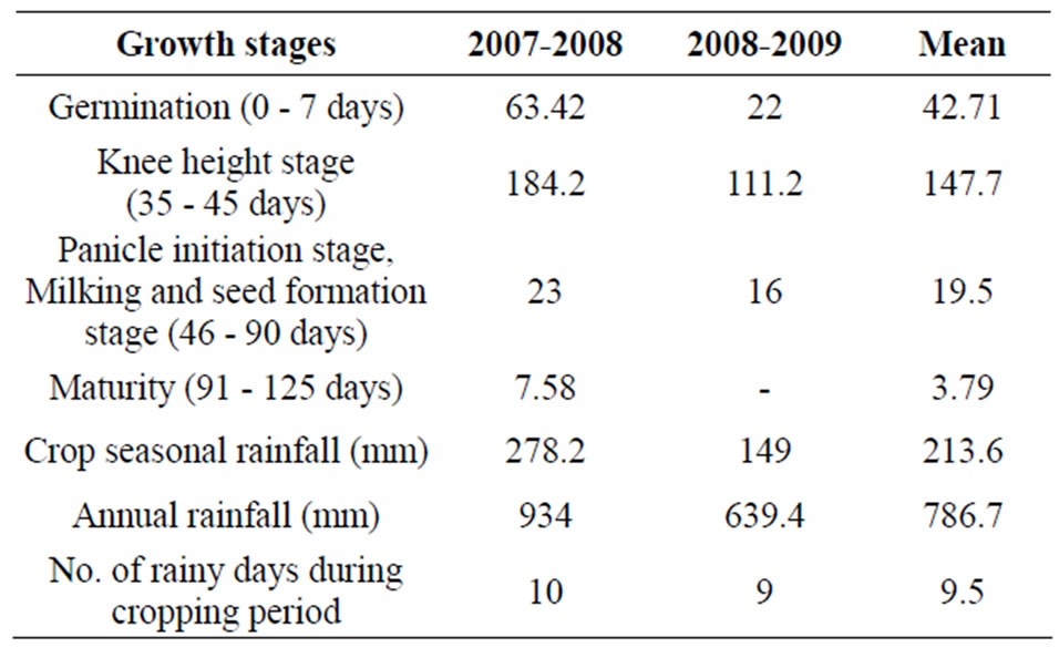 The rainfall received during the growing period from 27th September 2007 to 30th January 2008 was 278.2 mm with 10 rainy days. Similarly 15th September 2008 to 21st January 2009 was 149 mm with 9 rainy days. The rainfall received at different crop growth stages is given in Table 1. The annual rainfall received during 2007-2008 was much higher (934 mm) than 2008-2009 (639.4 mm), though the rainfall received during the cropping season of 2007-2008 was much higher (86%) but the yield of rabi sorghum during first year was less mainly due to incidence of shoot fly because of delayed sowing. There was sufficient soil moisture at seeding, initial growth and panicle initiation stage.