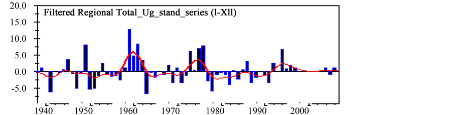 Cycles are observed in rainfall patterns in Uganda for the period 1940-2009. Analysis shows decades of normal and beyond normal rainfall (Figure 6) during the period of analysis. Three long spans of below normal rain are evident in the 1940s, 1960/70 and 1980s. Other particularly wet periods were experienced in early 1950s, 1960s, late 1970s and the 1990s (Figure 6). The contributing factors to the below average annual total rainfall for Uganda have not been established in this study despite the 1980s being drought years with consequences on food security for the continent [29] .