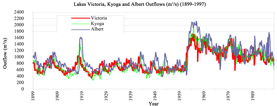 All rivers in Uganda ultimately reach the Nile through various interconnections. Thus an understanding of the Nile flows, gives us an insight into the flow regime of major rivers in Uganda. The flows of the Nile are highly variable from year to year. This annual variability has been monitored and reported in previous studies [3] [4] evidenced in Figure 2. The plot shows the long-term variations in flows monitored along Victoria Nile at Jinja, Kyoga Nile at Masindi Port and Albert Nile at Panyango. It shows the flow increased from 1960s, after which there is a steady decline in the flow at all monitoring points. The long-term average outflow from Lake Victoria has been 840 m3/s and the range of outflows is between a minimum of 345 m3/s and a maximum of 1720 m3/s. At the 95% monthly reliability level, the flow of the Victoria Nile is of the order of 495 m3/s.