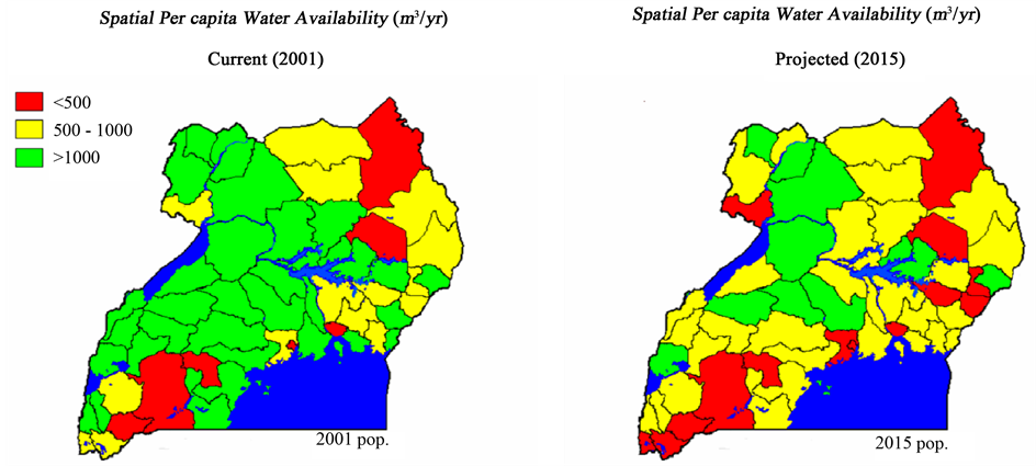 Despite Uganda’s significant water resources, their spatial and temporal variability often renders many parts of the country water stressed over long periods of the year. Water resource management sub-sector reform study of 2004 showed that, districts in the north-eastern and south-western parts of the country have the least per capita water availability. The study also reveals that by 2015 more than 75% of the country will be water stressed (Figure 3). The methodology used in computing the water availability only considers the runoff generated within each district. It is used here to give a picture of the average yield of major catchments in Uganda.