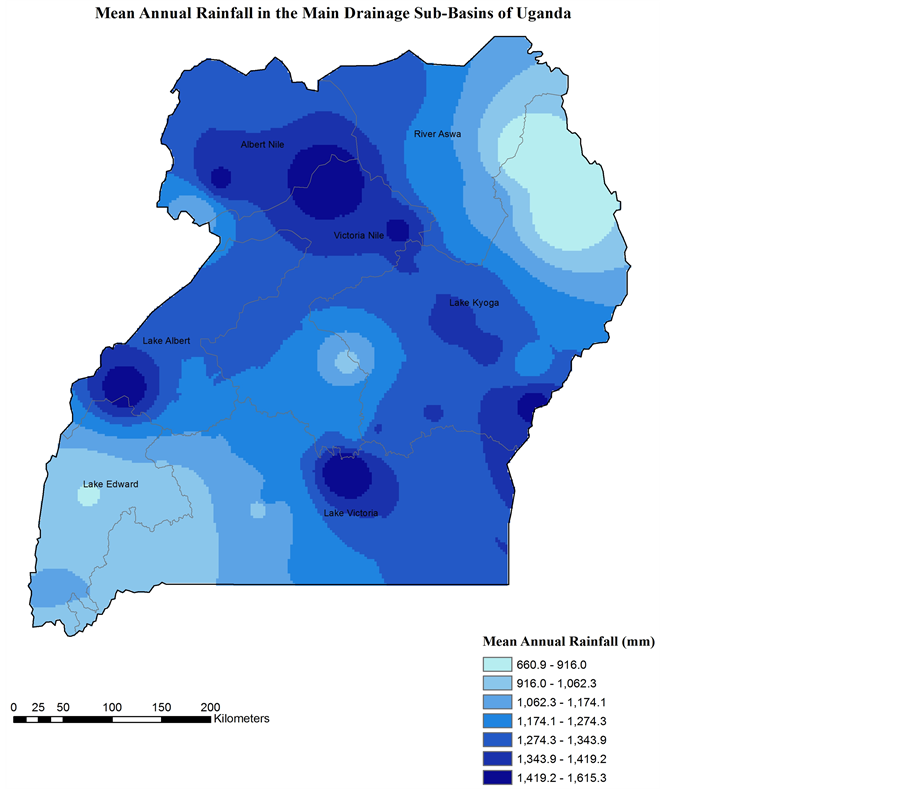 Uganda is a landlocked country that occupies 241550.7 km2 of land. Open water and swamps constitute 41743.2 km2 of area [4] , with about 16% of total land area of wetlands and open water, plus the annual water supply of 66 km3 in form of rain and inflows. One would therefore conclude that, Uganda is fairly well endowed with wa- ter resources. Since direct rainfall is the most important source of water resources in Uganda, understanding the