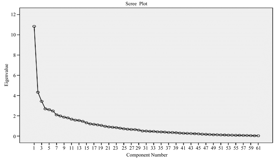 Figure 1. Scree plot showing the factor loading of the 61 items of the OCBS and its 3 most distinct components.