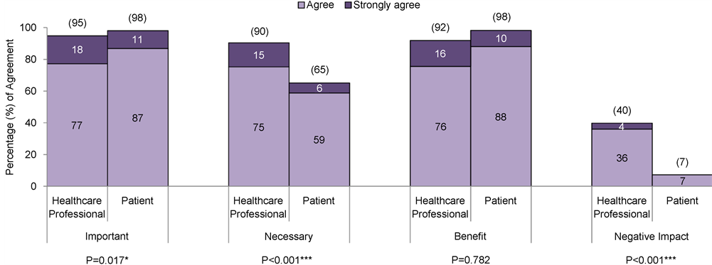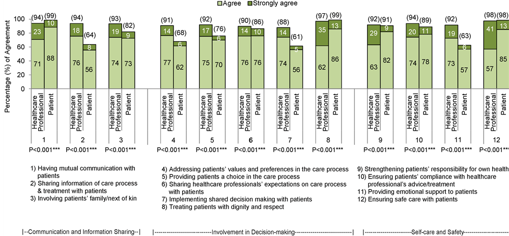 Figure 2. Agreement on 12 stated elements of patient engagement. (Chi-square tests were performed and a difference was considered to be statistically if p-value was < 0.05. *P-value < 0.05; **P-value < 0.01; ***P-value < 0.001, which means the correlation is significant at the 0.05, 0.01 and 0.001 level.)