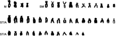 Karyotypes of R. o. ocellatus, as shown in Figure 1, had 2n = 48 including 8 metacentrics (M), 20 submetacentrics (SM) and 20 subtelocentrics (ST) or acrocentrics (A). Karyotype of R. a. fangi had 2n = 46 including 4 SM, 42 ST or A (Figure 2).