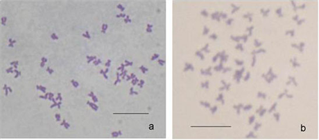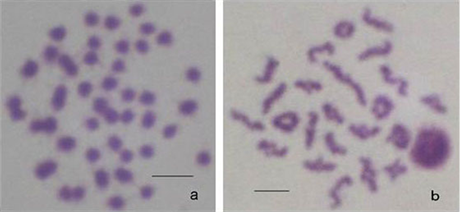 Figure 5. Two metaphase figures of F2 hybrid. Some obvious structural chromosomal aberrations were observed (b). They were stained with Giemsa. The scales indicate 10 micrometer.