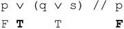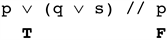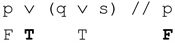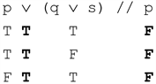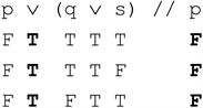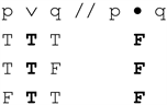 ”, and “p” is true. This makes the disjunction itself true, so let us put a “T” under the wedge: