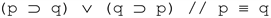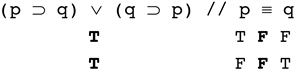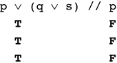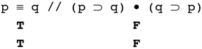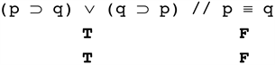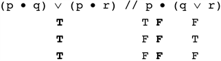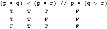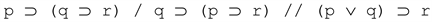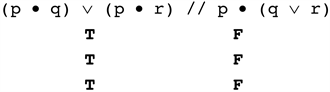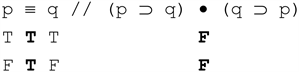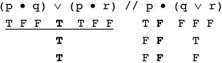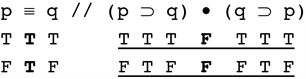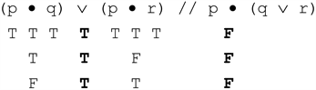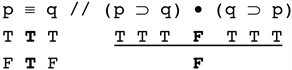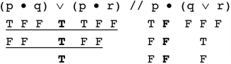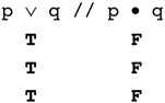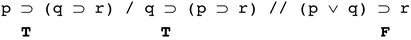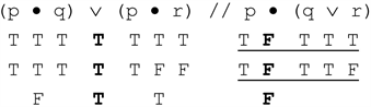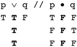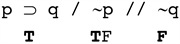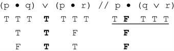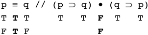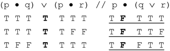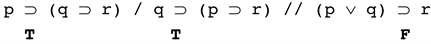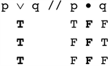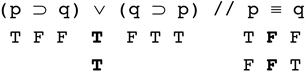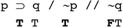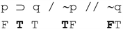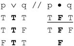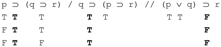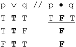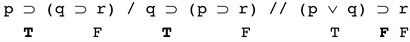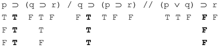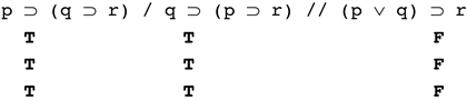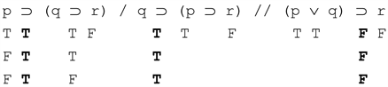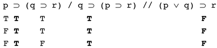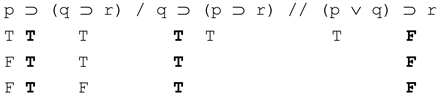 ”; “q”; therefore, “p”. Here are the three propositions (the premises separated from one another by a single slash and from the conclusion by a double slash), together with their respective truth tables: