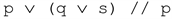 Since the only way for a disjunction to be false is for each of its disjuncts to be false, we know that “q” and “s” are false. Let us transfer those truth values to the first premise, where “q” and “s” appear. We get this: