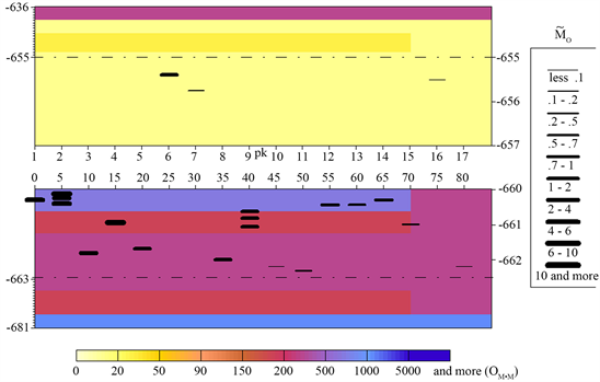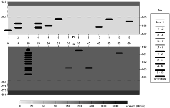 Figure 1. Geoelectrical section of a block-layered section of rock massif with inclusions of the second rank in a rock burst mine Tashtagol (the upper half of the section corresponds to the roof structure, the lower – to the floor) Morphology of anomaly stressed objects. Legend: = = M0 × L0 × 103, M0 is the coefficient by which the moment of the electric current line is multiplied, equivalent in field to the influence of the zone of geoelectric heterogeneity, and which is proportional to the ratio of the difference in conductivities in the enclosing medium and in inclusion to the conductivity in the enclosing medium, L0, the length of the current line, the resistance of the enclosing section is given in ohm.m. The vertical values are in m (absolute marks), the horizontal is the length of the output in pickets (pc) and meters.