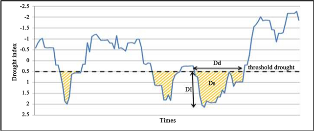 Figure 3. Three components of a drought: DS = Severity of drought events; ID = Intensity; Dd = Duration [25].