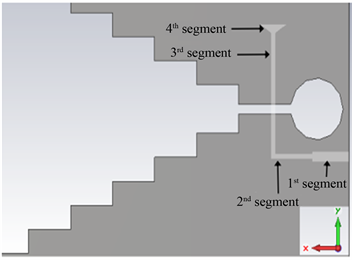 Figure 6 illustrates the L-shape feeding technique. In this technique, the feeding microstrip-line has four segments. At first segment, the strip is 0.4 mm wide and 3.5 mm long horizontally. The strip is 0.2 mm wide and 3.5 mm long in the second part. In the third segment, the length and width are the same as the second segment but this is aligned in the vertical position. Finally, triangular shape balun is connected with the vertically aligned segment.