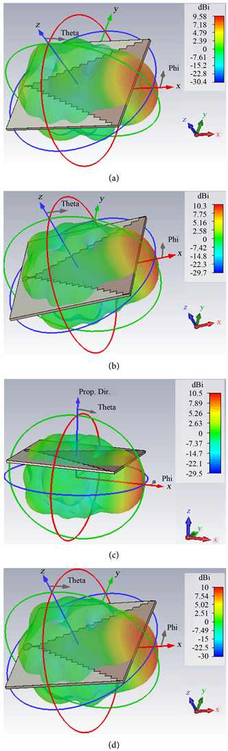Figure 10. The radiation pattern of the proposed antenna with and without balun and different feeding techniques. (a) Without balun; (b) With rectangular balun; (c) With circular balun and L-shape & I-shape feeding; (d) L-shape with balun feeding.