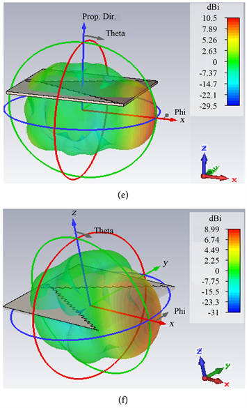 Figure 9. Directivity of the proposed antenna. (a) Without a balun; (b) With a rectangular balun; (c) With a circular balun; (d) I-shape feeding; (e) L-shape feeding; (f) L-shape with balun feeding.