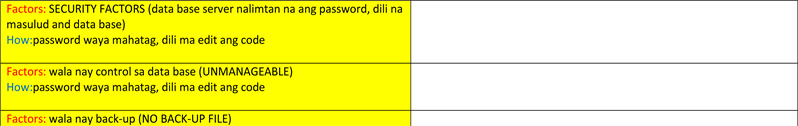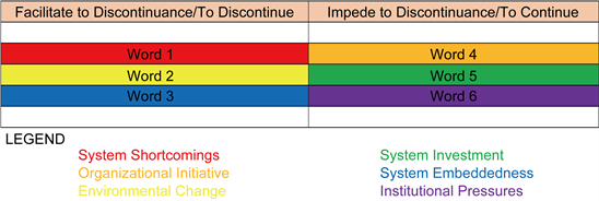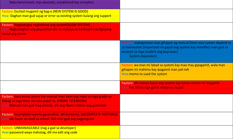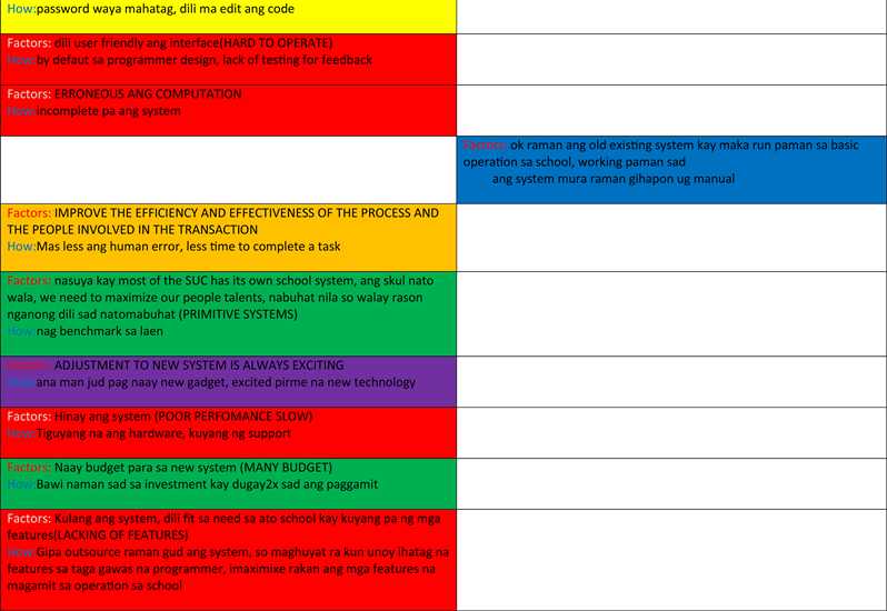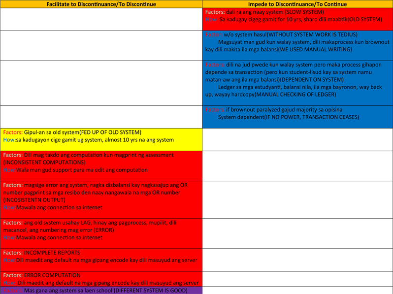 Data are needed to make a model specific to school level IS discontinuance intention. Data are collected via semi-structured interviews with school administrators and users of school information system (IS) (i.e. registrar’s front liners, cashiers, and accounting clerk) who were users and familiar with the school information system (IS). A second interview was conducted to test the reliability of the data. One on one meeting and group interview were used from their experience on using the old information system (IS) comparing to the new information system (IS) as to usability, user-friendliness, and promptness. The data are group into two themes, such as Facilitate Discontinuance and Impede discontinuance. Each word is assigned to each item. Assigned color coding of words to match the answers with system performance shortcomings, organization initiative, environmental change, system investment, and system embeddedness where most of the answer are vernacular and converted to English words as shown in Figure 3 which is represented different colors.