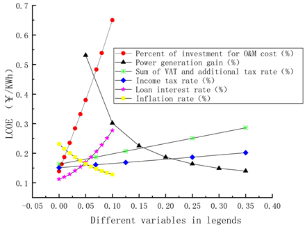 Under given conditions in Table 1, according to the degree of influence, the factors leading to the increase of LCOE are tracker operation and Percent of investment for O & M cost, direct investment per watt, loan interest rate, income tax rate, value-added tax and additional tax rate, land price and electricity price. Percent of investment for O & M cost is the most sensitive factor, which may determine the success or failure of a project.