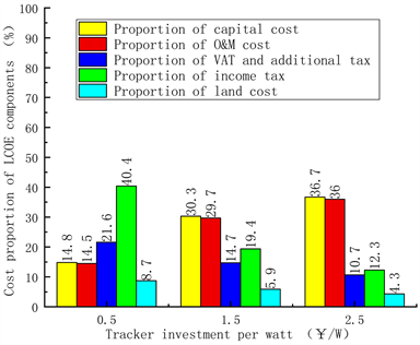 The factors affecting the LCOE of tracker were analyzed above. The factors that constitute the LCOE vary in degree. The proportion of each cost in the LCOE was shown in Figure 3. Unless otherwise given in the figure, values was given in Table 1. LCOE of solar tracker mainly includes capital cost, maintenance cost, VAT and additional tax, income tax and land cost. Among them, the capital cost is the discounted value of the total input of tracker after deducting depreciation fees and residual value.