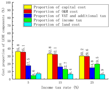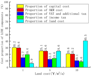 Among costs of LCOE, under given conditions, capital cost and maintenance cost account for the main part, followed by tax cost and land cost.
