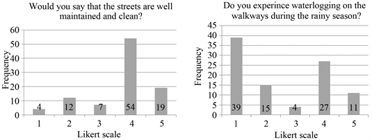 This study also found out that the proper drainage on the walkways, which prevents waterlogging are all important to provide a useful, safe, comfortable, pleasurable and meaningful setting for walking in urban public spaces such as Ngei Street. It was also found that the association between the condition of the walkway of the Ngei Street and walking behavior, not only as a way of accessing different parts of the street but also the overall experience that it offers to the pedestrian (Figure 8).