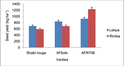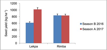 ANOVA in Figure 1 showed that seed yield varied significantly (P < 0.001) depending on the season-site interaction. At Lekpa, season A 2017 has more seed yield (1019.77 kg/ha) than in season B 2016 (616.22 kg/ha) and at Rimba, season B 2016 has more seed yield (838 kg/ha) compared to season A 2017 (834 kg/ha).