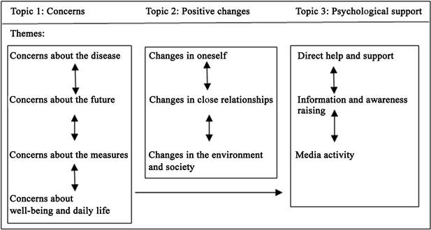 The first topic (participants’ concerns about the epidemic) led to four core themes: concerns about the disease, concerns about the future, concerns about the measures, and concerns about well-being and daily life.