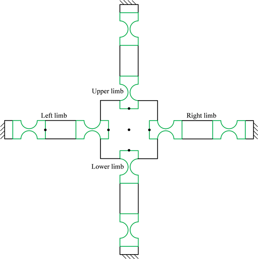 Compliant mechanisms are composed of the parallel mechanism and serial mechanism. The parallel mechanism is advantageous over the serial mechanism. In addition, to get excellent decoupled property, the parallel mechanism is usually designed with symmetric configuration. Thus, the compliance of a compliant stage with symmetric configuration, coupled with decoupled property is analyzed in this paper. Note that the proposed compliant stage is composed of 4 parallel limbs, the left limb, the right limb, the upper limb and the lower limb. As shown in Figure 3, each limb contains two circular flexure hinges. Therefore,